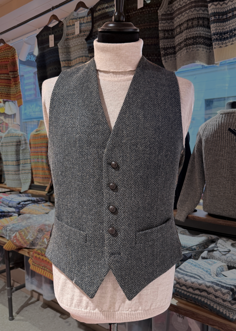 Harris Tweed Iain Väst – Mörkgrön fiskbensmönstrad