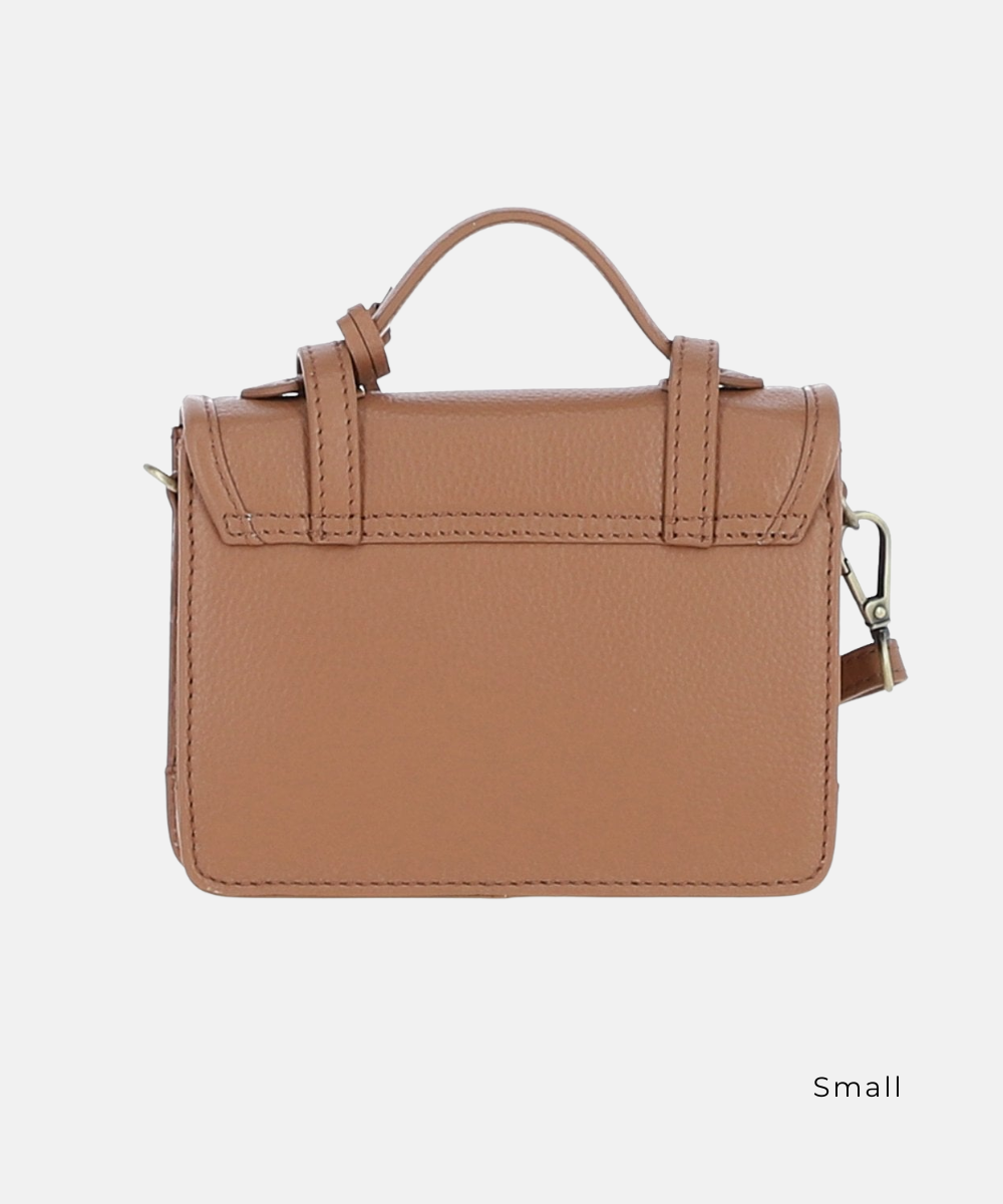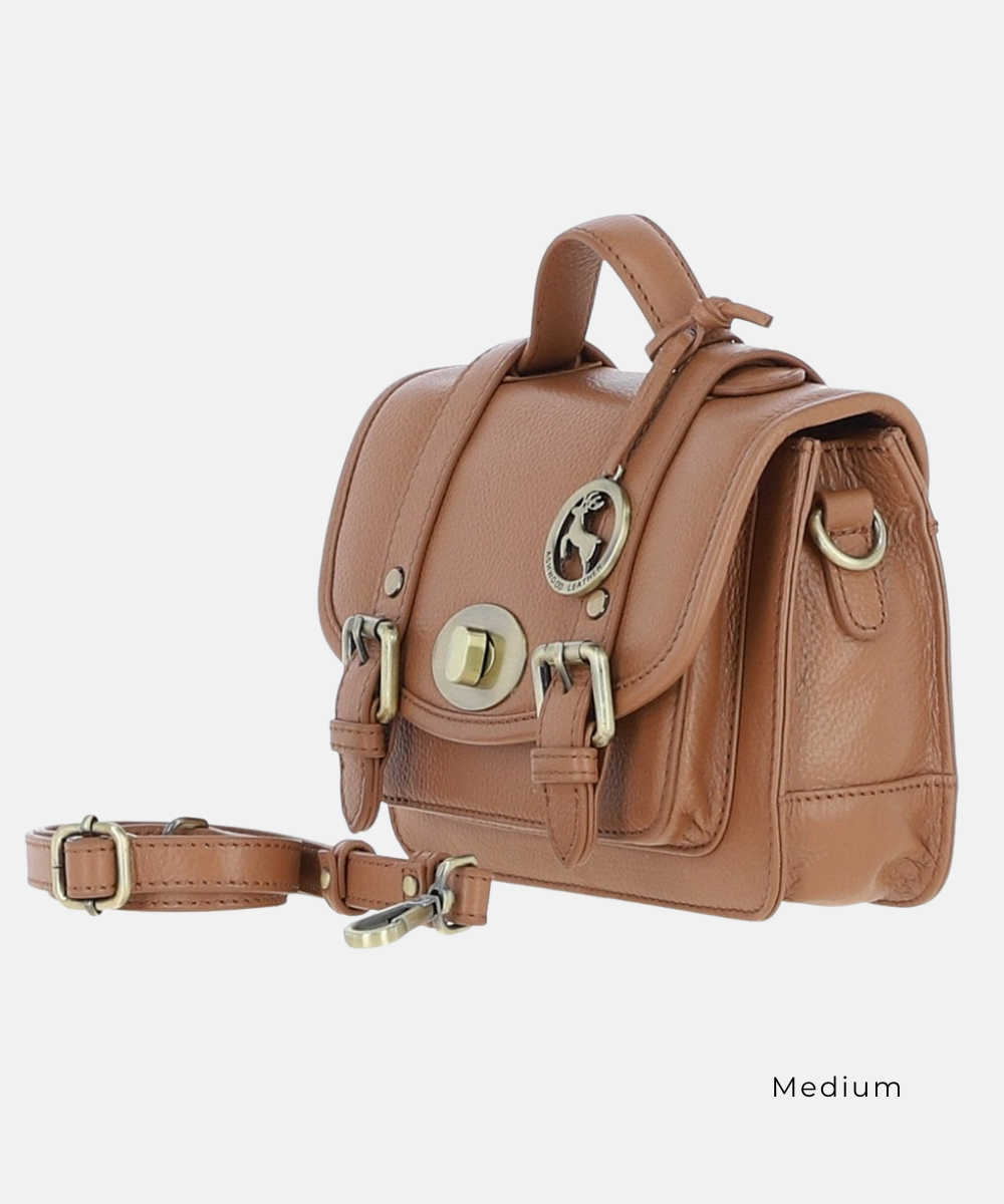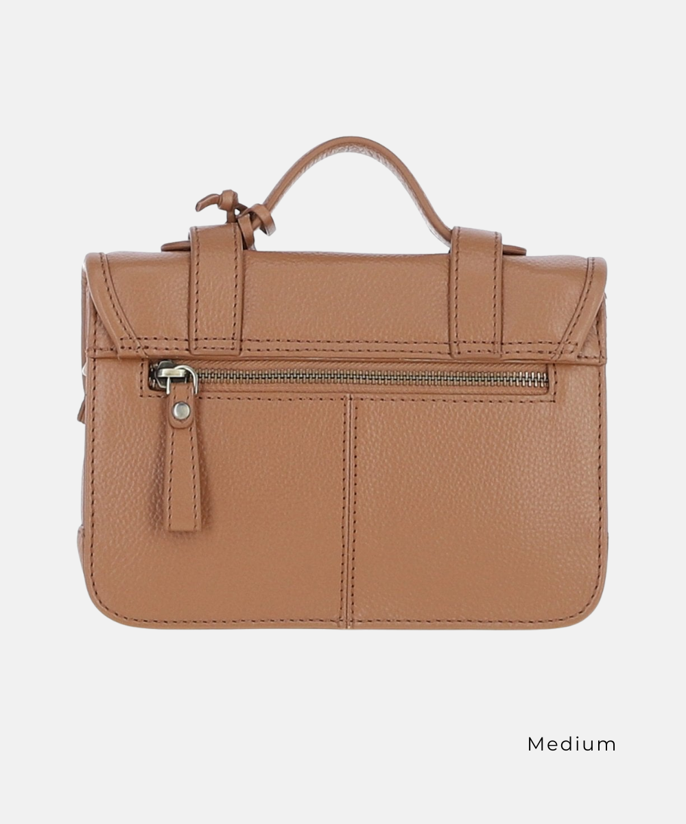 En elegant och tidlös satchelväska i äkta läder som kombinerar klassisk design med praktisk funktion. Den strukturerade silhuetten och de mässingsfärgade detaljerna ger väskan en stilren och sofistikerad karaktär, perfekt för både vardag och arbete.