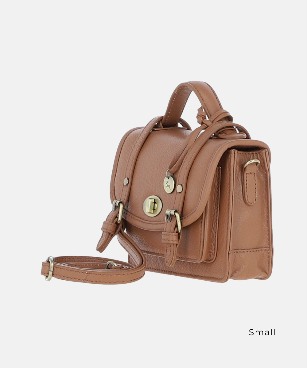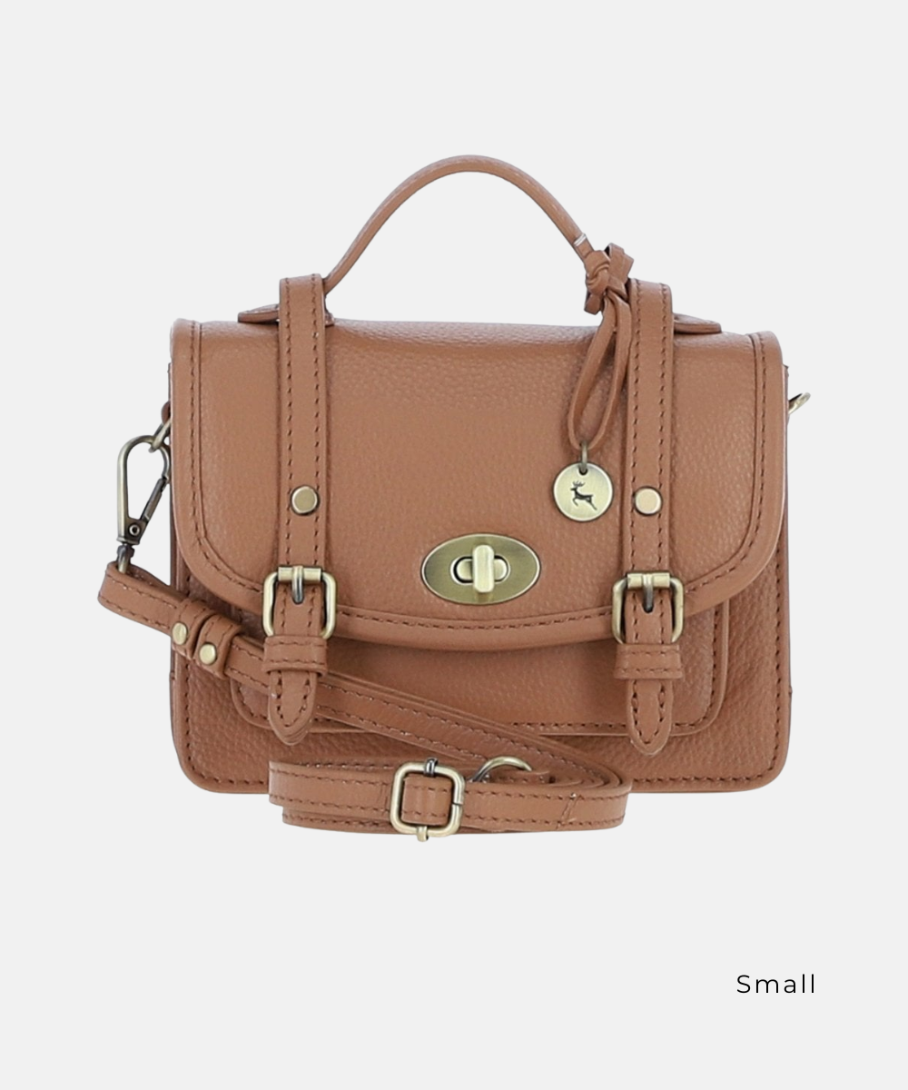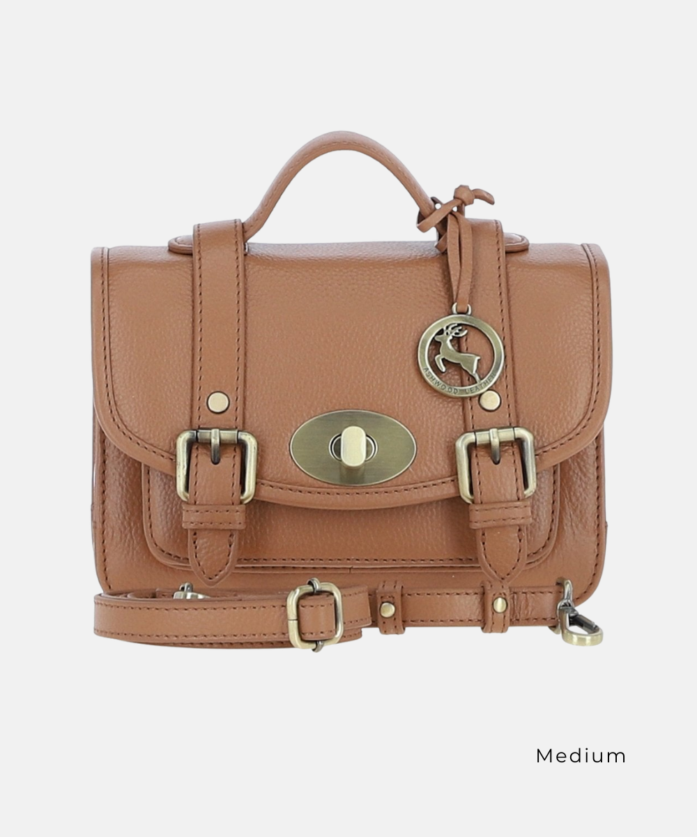 En elegant och tidlös satchelväska i äkta läder som kombinerar klassisk design med praktisk funktion. Den strukturerade silhuetten och de mässingsfärgade detaljerna ger väskan en stilren och sofistikerad karaktär, perfekt för både vardag och arbete.